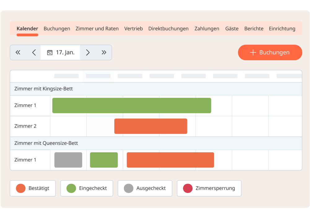 Ob Direktbuchungen auf Ihrer Website, über einen Online-Reisevermittler, den Channel Manager oder sogar Walk-Ins – Ihr Kalender erfasst alles in einem zentralen System.