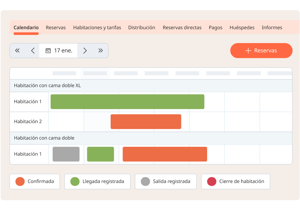 No importa si son reservas directas de tu web, si han llegado a través de una OTA, de un gestor de canales o si han llegado sin reserva, el calendario las agrupa todas en un mismo lugar.
